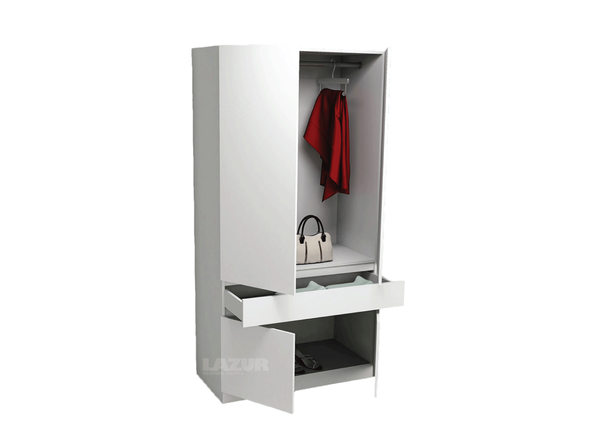 Гардеробът има две врати и едно удобно чекмедже отдолу, идеално за съхранение на аксесоари или други дребни вещи.